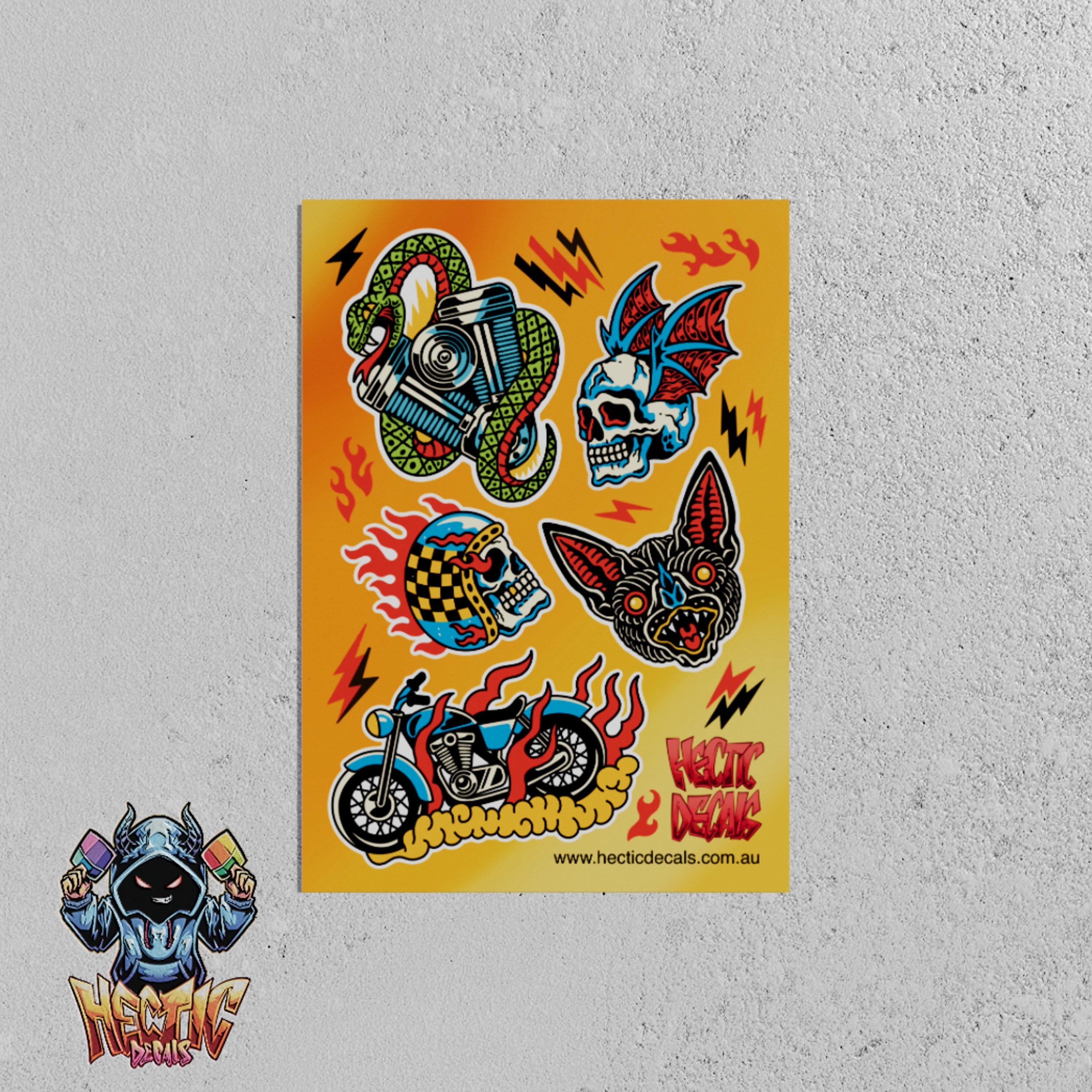 Ignite your creativity with the Hectic Neotrad Edition #1 Sticker/Decal Sheet. This exciting collection features a variety of cool vehicle-themed designs, including skulls and flames, perfect for young enthusiasts looking to personalize their belongings. Use these decals to decorate notebooks, skateboards, or any other gear!