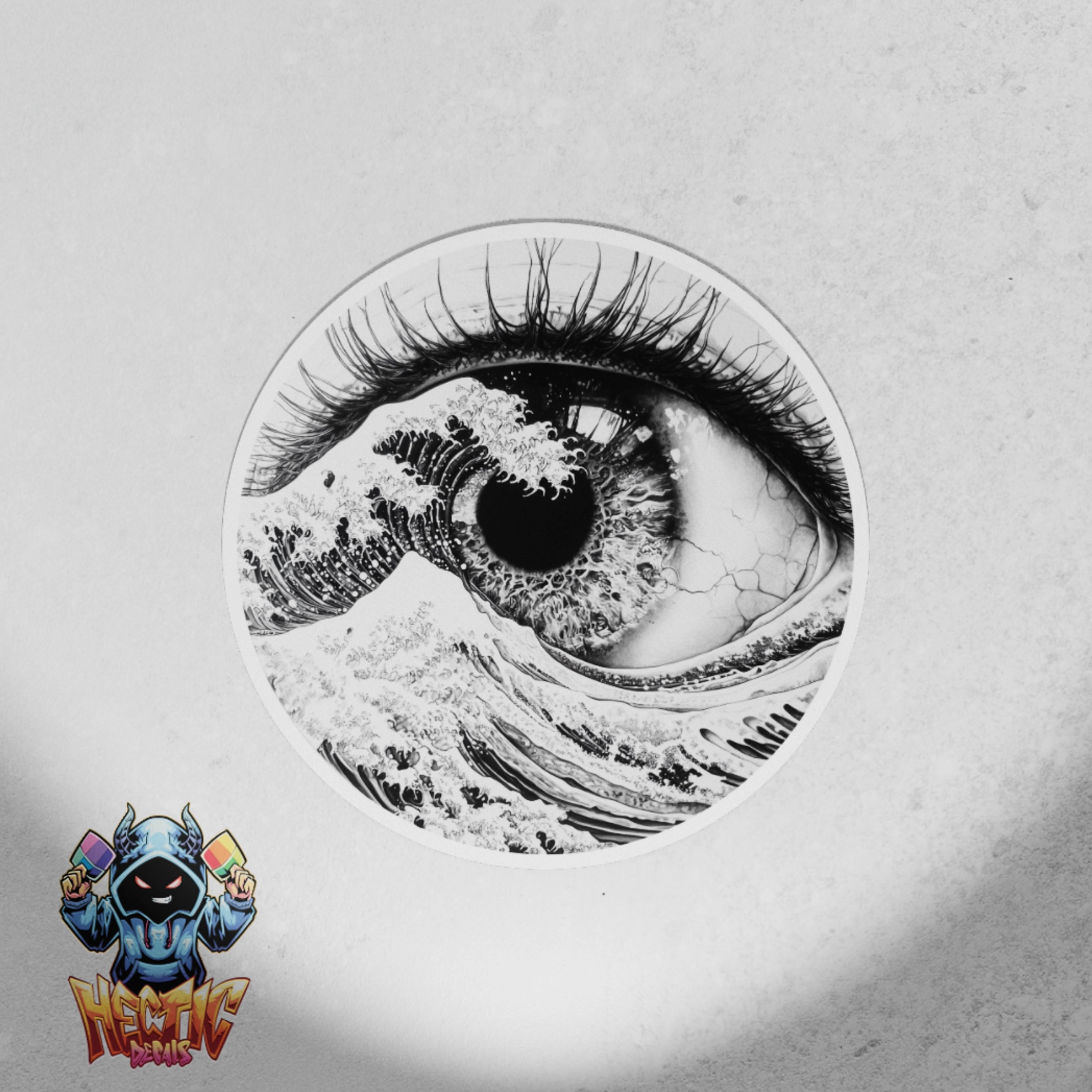 Delve into the emotional depths with the Tide of Sight decal. This striking abstract sticker features a detailed eye amidst crashing waves, symbolizing the connection between human emotion and nature.